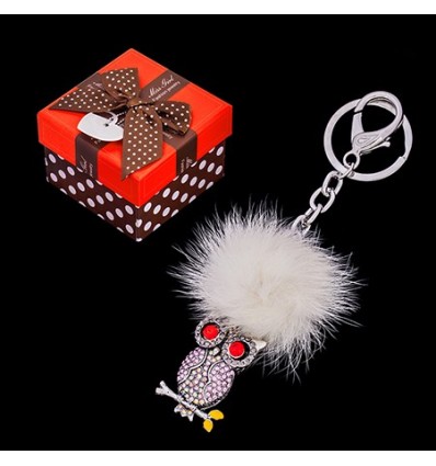 Модерен дамски ключодържател с бял пух от естествен косъм и кристали. Подходящ аксесоар за дамска чанта и раница. Визията се допълва от малко бухалче, покрито с нежни розови кристалчета и бяло пухче. Ключодържателят е с дължина 14см. Цената включва луксозна подаръчна кутия с размери 8,8см. х 8,8см., височина - 6см. Прекрасен подарък за любим човек.