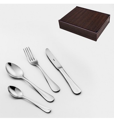 Материал: стомана 18/10 ,дебелина 2,50 мм. Комплектът съдържа 6 лъжици/супа/ , 6 вилици,6 ножа и 6 десертни лъжици