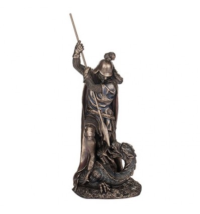 Свети великомъченик Георги Победоносец е един от най-тачените светци, мъченик за Христовата вяра. Той е почитан и от източните, и от западните християнски църкви. По времето на император Диоклециан той е войник в Римската империя. Георги получава военната титла трибун едва на 20 години, след като се проявява като пълководец. През 303 г. Диоклециан издава едикт за преследване на християните в цялата империя. На Георги е заповядано да вземе участие в преследванията, но вместо това той се открива като християнин и критикува решението на императора. Разяреният Диоклециан нарежда Георги да бъде подложен на мъчения и да бъде екзекутиран като предател. Мощите на свети Георги са погребани в палестинския град Лида . Скоро след това християните започват да го почитат като мъченик за многото чудеса, които извършил след смъртта си като небесен воин и закрилник. Гергьовден /6 май/ е денят, в който се чества Св.Георги с освещаване на армейските знамена и военен парад. Статуетката е изработена прецизно от полирезин с покритие от метал и с внимание към всеки детайл Размери на статуетката: h 29.5 см