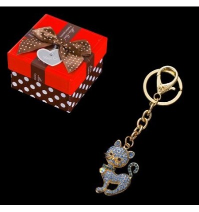 Модерен дамски ключодържател с кристали. Подходящ аксесоар за дамска чанта и раница. Ключодържателят е с форамата на красива елегантна котка, обсипана със сини кристалчета. Ключодържателят е с дължина 12см. Цената включва луксозна подаръчна кутия с размери 8,8см. х 8,8см., височина - 6см. Прекрасен подарък за любим човек.
