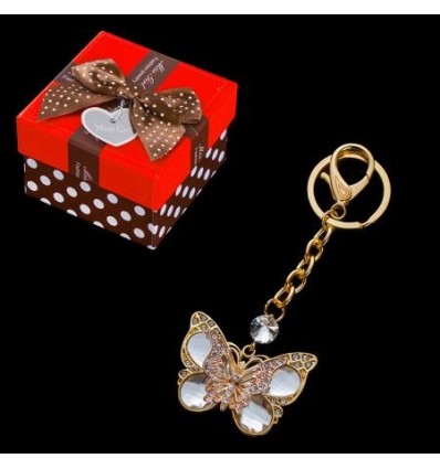 Модерен дамски ключодържател с кристали. Подходящ аксесоар за дамска чанта и раница. Ключодържателят изобразява красива пеперуда, нежно обсипана по крилцата с цветни кристалчета и камъни. Ключодържателят е с дължина 12,5см. Цената включва луксозна подаръчна кутия с размери 8,8см х 8,8см, височина - 6см. Прекрасен подарък за любим човек.