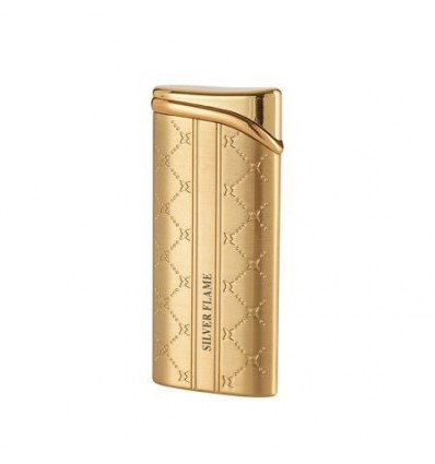 Тънка елегантна златиста запалка с красиви орнаменти и надпис „ Silver Flame “. Получавате запалката с гаранционна карта и луксозна подаръчна кутия с размери – 10/10/3,5 см. Пиезо запалване , JETпламък. Размери: 3/6,5 см.
