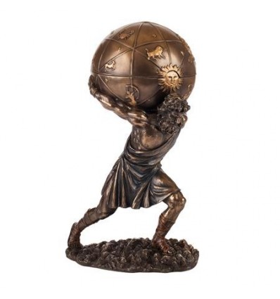 Атлас е титан от второто поколение на древногръцката митология - брат на Прометей. Отличава се с голяма сила. Наказан е от Зевс да крепи на раменете си небето, защото участвал в бунта на титаните срещу боговете. Трябвало да крепи небето на Запад, в близост до градините на хесперидите, затова океанът там получил името Атлантически. Атлас продължил да крепи небесния свод, докато боговете и титаните не се помирили. Статуетката е изработена прецизно от полирезин с покритие от метал и с внимание към всеки детайл. Размери на статуетката: h 29 см