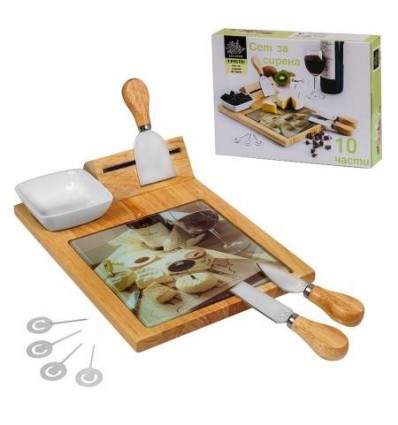 Комплектът включва: Нож за пармезан, нож за нож за меки сирена, нож за твърди сирена, порцеланова купичка , 4бр. метални клечки за сирена подложка за рязане от темперирано стъкло, дървена поставка с магнитен държач за ножовете. Размери :дълж. 22см.,шир. 30см.
