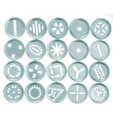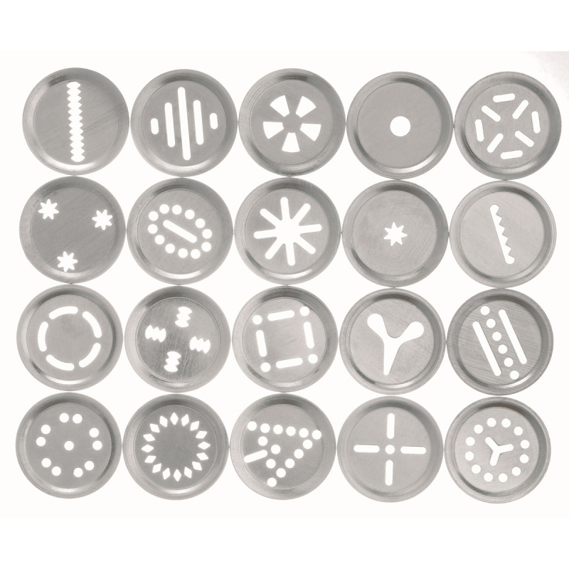 Съдържа 20 алуминиеви шаблона с различна форма и 4 пластмасови дюзи за шприцоване
