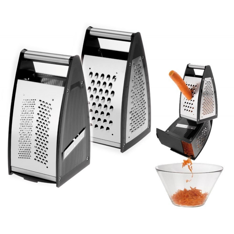 Четиристранното метално ренде QUINTO е универсално със своите четири режещи повърхности, можете да режете и стържете зеленчуци, плодове, твърди и меки сирена, ядки и шоколад.