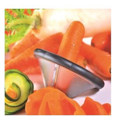 Този нов прибор на GEFU вдъхновява кулинарите да създават творчески ястия и вкусни и разнообразни декорации. С помощта на този прибор, различни твърди зеленчуци могат да се нарежат на спирали или декоративни малки рози. Моркови, тиквички, репички и други зеленчуци се превръщат в акцент на всяка салата или ястие. Лесен за употреба – подобно на острилка. За храни с диаметър 75 мм. Назъбено острие.