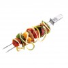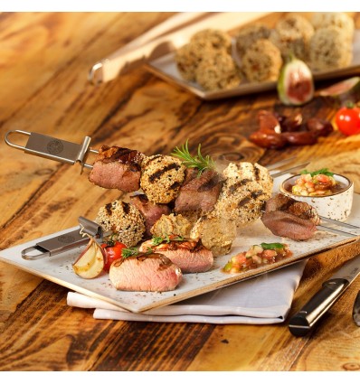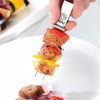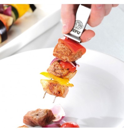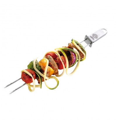 Тези шишчета са идеално пригодени за месо, риба, зеленчуци и морски дарове. Просто заредете двойните шишчета по Ваше желание и ги поставете на барбекюто или в тигана. Благодарение на ъгловата форма, късовете храна остават на местото си без подхлъзване. Интегрираният плъзгач подпомага лесното изваждане на храната от шиша, гарантирайки пълна чиния и чиста маса. Дължина: 32см. Материал: 18/10 неръждаема стомана. Подходящи за съдомиялна машина.