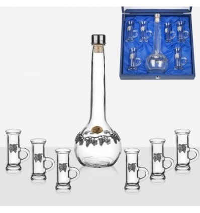 Сет за аперитив/ракия/, състоящ се от 6 бр. чаши и бутилка от кристално. Бутилката е с оригинална форма на колба с метална запушалка с коркова тапа за добро уплътняване. Богатата натуралистична декорация-венец от лоза около съда и грозд с листа върху чашите, превръщат комплекта в артистично средство за поднасяне на алкохолни напитки. Изработена е от сплав от калай и сребро. Предлага се в подаръчна синя дървена кутия. Произведен в Португалия от „Freitas & Dores“.