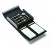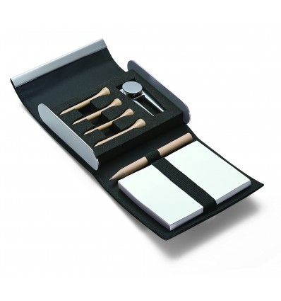 Черна кожа и полирана неръждаема стомана е използвана, за да се създаде този елегантен комплект за голф. Затваря се с магнитна лента.
