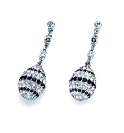 с редуващи се черни и бели кристали. Изработена е от бижутерийна сплав с родиево