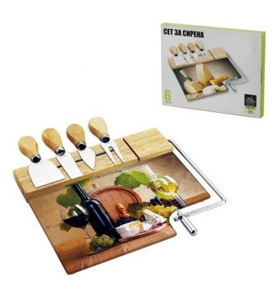 Комплектът включва: нож за пармезан, нож за твърди сирена, нож за меки сирена, вилица за сирене, подложка за рязане, изработена от темперирано/закалено/ стъкло, което го прави безопасно за употреба. За удобство приборите се поставят върху дървена поставка с магнитен държач .Комплектът съдържа и метална корда, подходящ за рязане на меки сирена.