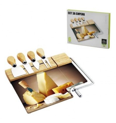 Размери :дълж.26см., шир.23смКомплектът включва: нож за пармезан, нож за твърди сирена, нож за меки сирена, вилица за сирене, подложка за рязане, изработена от темперирано/закалено/ стъкло, което го прави безопасно за употреба. За удобство приборите се поставят върху дървена поставка с магнитен държач .Комплектът съдържа и метална корда, подходящ за рязане на меки сирена..