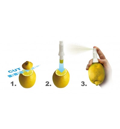 Модерен и много полезен уред за изстискване на лимон, лайм и др. Този спрей извлича пресен сок от всеки цитрусов плод. Леко размачкайте плода, за да извлечете по-лесно сок от него. Срежете му върха и с въртеливи движения завийте спрея в сърцевината му.