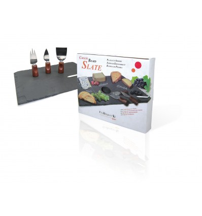 Комплектът за сервиране на сирена на Vin Bouquet предлага каменна плоча, върху която да подредите различните видове сирене, специален молив за надписване на всеки вид сирене и три ножа – за твърди, меки и крема сирена.