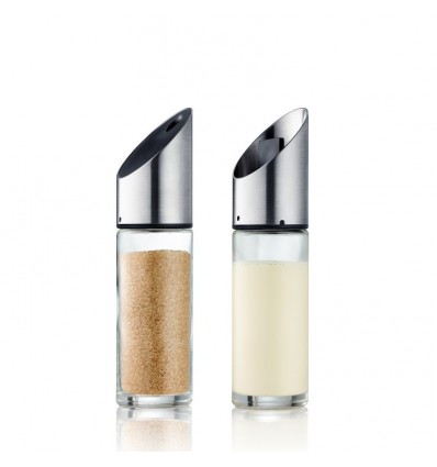 BLOMUS Комплект за захар и сметана LIVO • Височина: 19 см • Диаметър: Ø 5 см • Вместимост: 125 мл • Материал: матирана неръждаема стомана, стъкло, силикон • Производител: BLOMUS, Германия