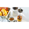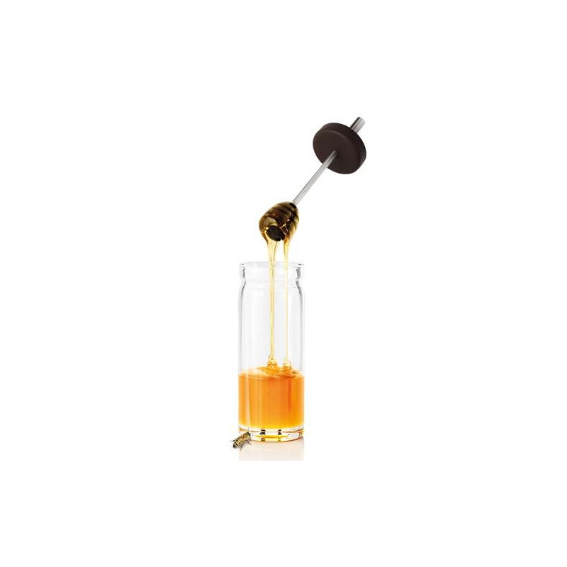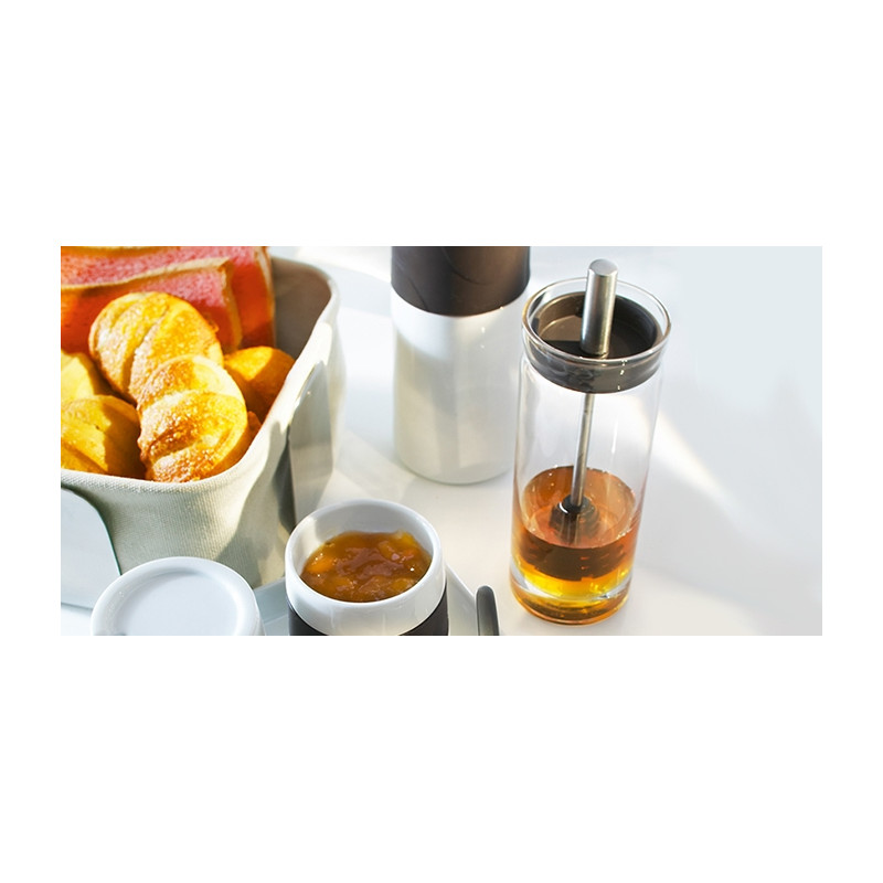 BLOMUS Бурканче за мед с лъжица DESA • В комплекта: бурканче, лъжичка • Височина: 19 см • Диаметър: Ø 6,5 см • Материал: неръждаема стомана, стъкло, силикон • Производител: BLOMUS / Германия