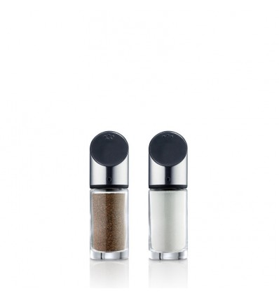 BLOMUS Комплект за сол и пипер LIVO • Височина: 12 см • Диаметър: Ø 3,5 см • Вместимост: 40 мл • Материал: матирана неръждаема стомана, стъкло, силикон • Производител: BLOMUS, Германия