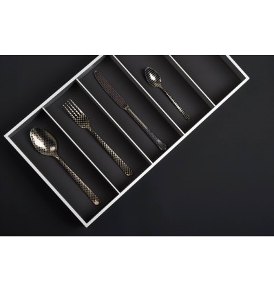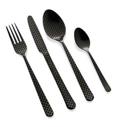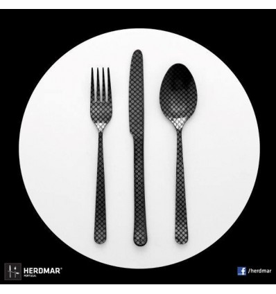 Комплект прибори за хранене Herdmar "OSLO №11" за 6 човека от 24 части. • Изработен от неръждаема стомана 18/10• Лазерно гравиран• Цвят: черен мат• PVD покритие Комплектът включва: • Нож за хранене: 6 бр. • Вилица за хранене: 6 бр. • Лъжица за хранене: 6 бр. • Десертна лъжичка: 6 бр. ПРОИЗВОДИТЕЛ: HERDMAR / Португалия