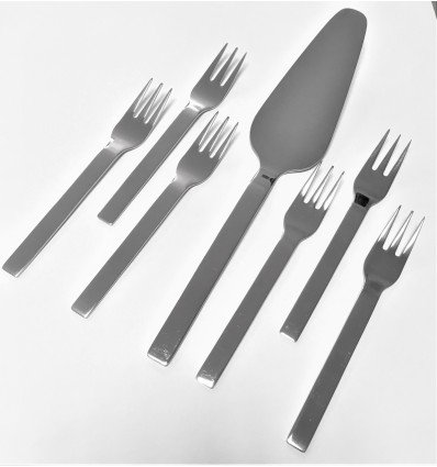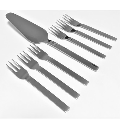 HERDMAR Комплект прибори за торта “TURINI“- 7 части • Изработени от неръждаема стомана • Подходящи за почистване в съдомиялна машина. Комплектът включва: • Вилица за торта: 6 бр. • Лопатка за сервиране: 1 бр.ПРОИЗВОДИТЕЛ: HERDMAR / Португалия