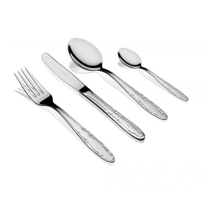 HERDMAR Комплект прибори за хранене "LOLA" за 6 човека от 24 части. • Изработени от неръждаема стомана 18/10 • Подходящи за почистване в съдомиялна машина. Комплектът включва: • Нож за хранене: 6 бр. • Вилица за хранене: 6 бр. • Лъжица за хранене: 6 бр. • Десертна лъжичка: 6 бр. ПРОИЗВОДИТЕЛ: HERDMAR / Португалия