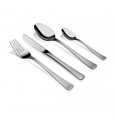 HERDMAR Комплект прибори за хранене "MIKADO" за 4 човека от 16 части. • Изработени от неръждаема стомана 18/10 • Подходящи за почистване в съдомиялна машина. Комплектът включва: • Нож за хранене: 4 бр. • Вилица за хранене: 4 бр. • Лъжица за хранене: 4 бр. • Десертна лъжичка: 4 бр. ПРОИЗВОДИТЕЛ: HERDMAR / Португалия