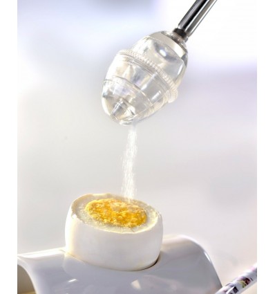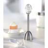 Поставете прибора върху яйцето (рохко или твърдо сварено). Издърпайте топчето на върха и го оставете да се върне в изходна позиция, за да образува пукнатина на яйцето. Махнете черупката, ако е необходимо. С вградена солничка. Изработен от неръждаема стомана и висококачествена пластамаса. Дължина: 16см.