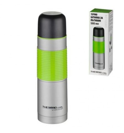 Метален термос с вместимост 500 мл., за продължително съхранение на топли и студени напитки. Капачката може да се използва и за чашка. Зелената силиконова релефна част на термоса го прави лесен за захващане.