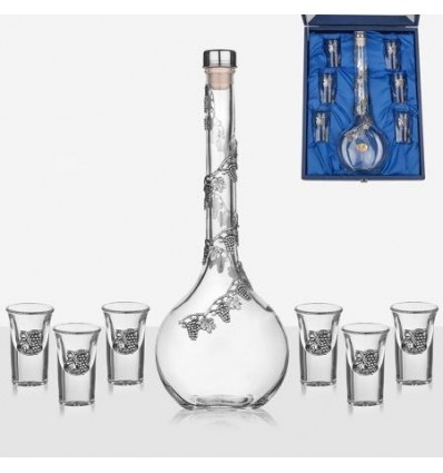 Предлагаме Ви този страхотен комплект изработен от португалската фирма „Freitas & Dores“. Комплектът се състои от 6 чаши за аперитив и изискана бутилка. Изящната декорация е изработена от сребро и калай и в допълнение с внимателно изваяните форми на всяка част на комплекта във Вашите ръце се озовава перфектният подарък за юбилей, рожден ден, сватба, годишнина или друг забележителен повод.