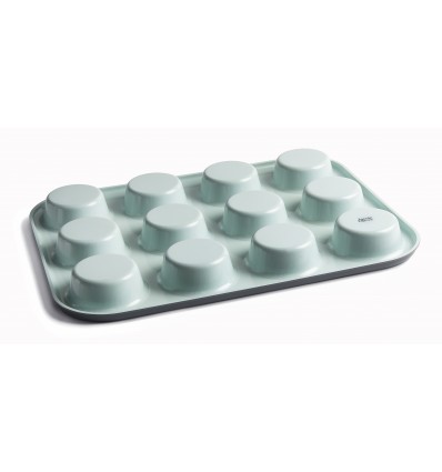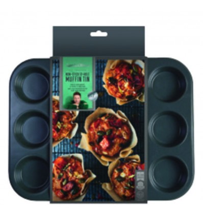 JAMIE OLIVER Форма за 12бр мъфини• Размери: 35см х 27см х 3см• Диаметър на мъфина: Ø 5 ( на дъното ) -  Ø 7,5 ( в горната част )• Безвредно незалепващо покритие Quantum II, без съдържание на PFOA;• По-дълбоки чашки, подходящи за всякакви мъфини и тарталети;• Двоен слой незалепващо покритие• Заоблени ръбове за добавена здравина и устойчивост, без огъване;• Комбинация от светло син и тъмно сив цвят • За температура до 240°С
