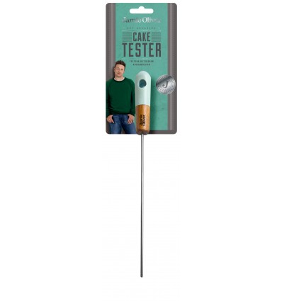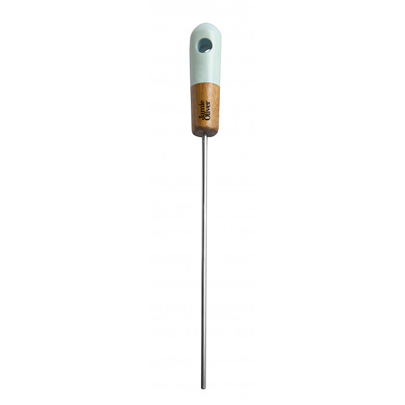 Прибор за тестване на готовност на тестени изделия Jamie Oliver• Материал: Стомана, Дърво• Дръжка от акациево дърво със светло син край и дупка за окачване• Лесно разбирате кога блатът е готов - Без повече прахосване на клечки за зъби и дървени шишчета!• Краят на прибора може да се използва и за декорации вместо шип или вилица