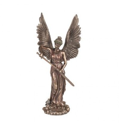 Ангел е свръхестествено, безсмъртно, разумно същество, изразяващо волята на Бога и притежаващо нечовешки умения и възможности (способност да бъде невидим, способност да лети, ясновидство, способност да унищожава цели градове). В представите на съвременните хора ангелите обикновено са хвъркати и безполови, в одежди и крила с бял цвят, символ на невинност. Вярва се, че има ангели, които закрилят места, народи или отделни хора. През Средновековието става разпространено схващането, че след тайнството на кръщението, човек получава ангел пазител до себе си, който бди над него през целия му земен път, стои зад дясното му рамо и говори с гласа на съвестта. Статуетката е изработена прецизно от полирезин с покритие от метал и с внимание към всеки детайл. Размери на статуетката: h 35 см