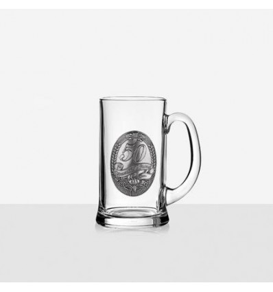 Оригинална халба за бира от стъкло с удобна дръжка. Семпла декорация-плочка от метална сплав от калай и сребро и празнична гравюра „50“. Произведена в Австрия. Размери: Ø 8 см. , височина на халабата - 15 см. , вместимост на халбата - 500 мл.