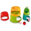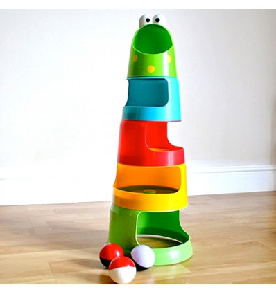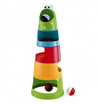 Вашето дете трябва да построи кулата и да пусне топчетата в устата на жабата, а те през специални улеи и дупки ще слязат най-долу. За децата е много интересно да наблюдават пързалянето на топчето надолу, едното от които е светещо.