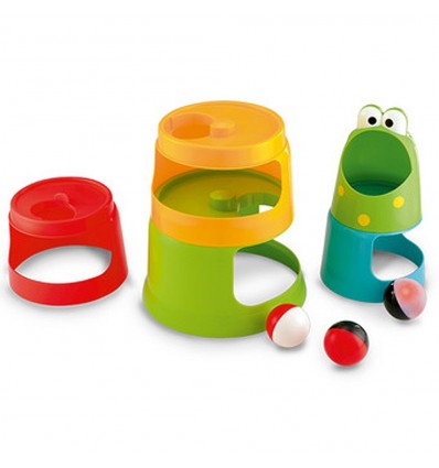 Комплекта съдържа 5 броя кофички с различен цвят и големина , като най-горната от тях е във формата на жаба и 3 броя топчета.