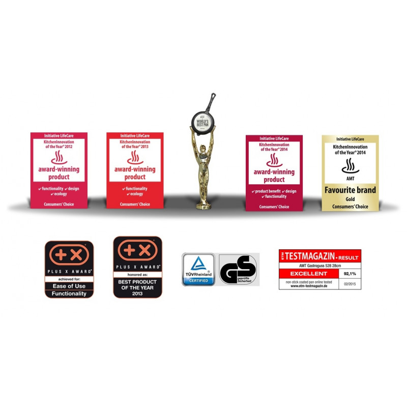 <p>Готвенето със съдовете <em>AMT Gastroguss</em> демонстрира отлични резултати. <br />Корпусът е изработен от лят алуминий, който е с отлична акумулация на топлина и невероятна топлопроводимост. <br />Дъното е с дебелина от 9мм, което го предпазва от деформации при много високи температури. <br /><strong>Lotan®</strong> не съдържа вредни химични съединения - <strong>PTFE</strong> (поли-тетра-флуоро-етилен) и <strong>PFOA</strong> (пер-флуоро-октанова-киселина) <br /><strong>Lotan®</strong> е от ново поколение незалепващо покритие, което в допълнение към отличните си незалепващи свойства предотвратява развитието на бактерии поради уникалната си структура. <br />Съдовете <em>AMT Gastroguss</em> са изработени от екологично чисти материали, като в тях се готви вкусна и здравословна храна без да се притеснявате за своето и близките си здраве. <br />Всички съдове <em>AMT Gastroguss</em> са проектирани и произведени в завода на АМТ Германия <img src="{{media url="/amt-lotan2.jpg"}}" alt="" /></p> <p> </p> <p> </p> <p><strong>1</strong>.Отливка, изработена от специална висококачествена алуминиева сплав.<br /><strong>2</strong>.Абразивното бластиране увеличава площта 12 пъти, давайки възможност за по-добро сцепление между следващите слоеве.<br /><strong>3</strong>.Слой от титаниев оксид, получен при температура 20 000°С; твърд почти колкото диамант и изключително устойчив на надраскване.<br /><strong>4</strong>.Подсилено керамично покритие - перфектна връзка между средния пласт и базата от титаниев оксид - този слой осигурява оптимална защита против корозия.<br /><strong>5</strong>.По-плътно покритие, обогатено с керамични частици за изключителна устойчивост и оптимално сцепление между горния и долния слой. <br /><strong>6</strong>.Слой незалепващо покритие, изработен по уникалната технология <strong>Lotan®</strong>  с анти-бактериален ефект</p>