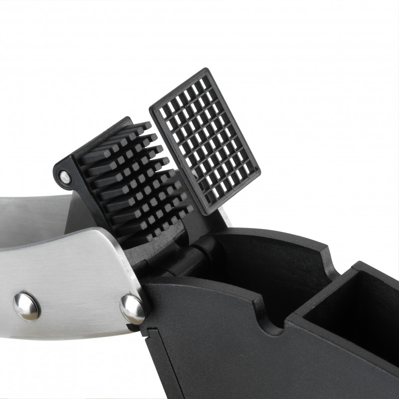 Материал: пластмаса и висок клас неръждаема стомана.Със защитно устройство за заключване . Не мачка скилидките, а ги нарязва, за по-свеж аромат!С тази преса получавате по-добър вкус,  не остават влакна. Подходящ дори за големи скилидки. Лесно използване и ергономична дръжка. Сменяем режещ инструмент и решетка, което Ви гарантира лесно почистване.