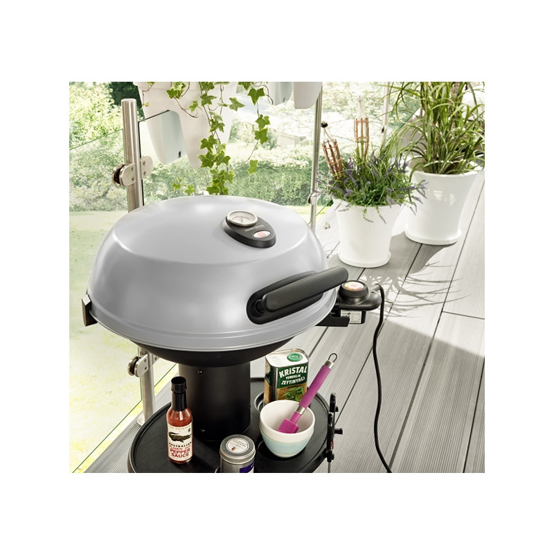 Електрическото барбекю Rommelsbacher BBQ 2004/S е идеално за приготвянето на различни видове зеленчуци и месо за вашите любими ястия. Барбекюто е снабдено с разглобяема грил плоча с диаметър Ø40 см и с 2 оребрени и 1 гладка зони за готвене. Почистванео на грил плочата става много лесно благодарение на 3-слойното покритие с което разполага. Барбекюто разполага още със закрепен на панти капак, температурен дисплей на капака, подвижен температурен регулатор за настройка на желанат от вас температура и улей за изтичане на излишната мазнина, която се събира в тавичката предназначена за тази цел. Уреда има удобна стойка, здрава основа, която ви гарантира безопасност при употреба, тавичка с възможност за закачане на готварски щипки и поставяне на сосове за овкусяване. С това барбекю може да приготвяте хранат си на отворен или затворен капак. Директно печене на скара с отворен капак – с топлина от отдолу. Препоръчително за храна с време за приготвяне под 25 минути, например, всякакъв вид стекове, котлети, наденички, шишове от месо, зеленчуци или риба, морски дарове и други. Индиректно печене на скара със затворен капак – препоръчва се за храна с по-продължително време за приготвяне, например цели пилета или риби, вретена и други. Топлината се разпределя равномерно, храната се приготвя равномерно и остава крехка и сочна. Приготвяйте бързо, лесно и вкусно любимите си ястия с Rommelsbacher BBQ 2004/S.