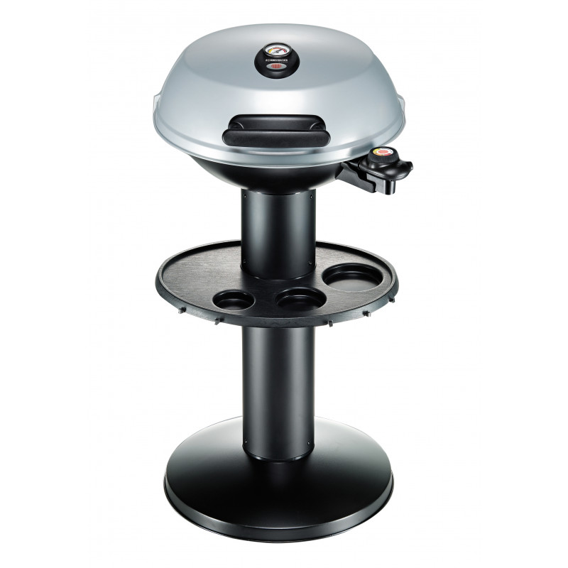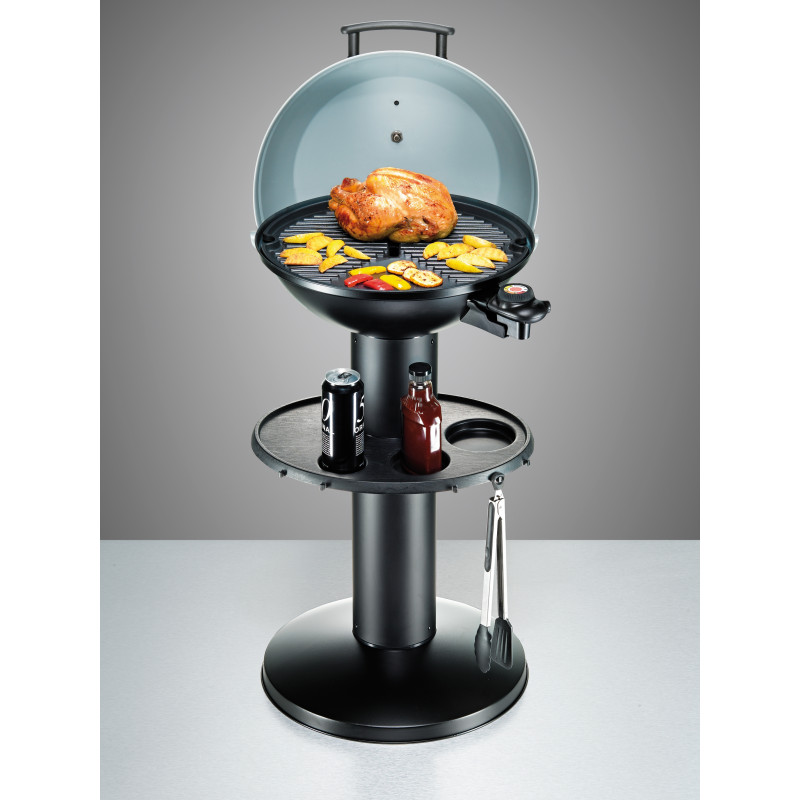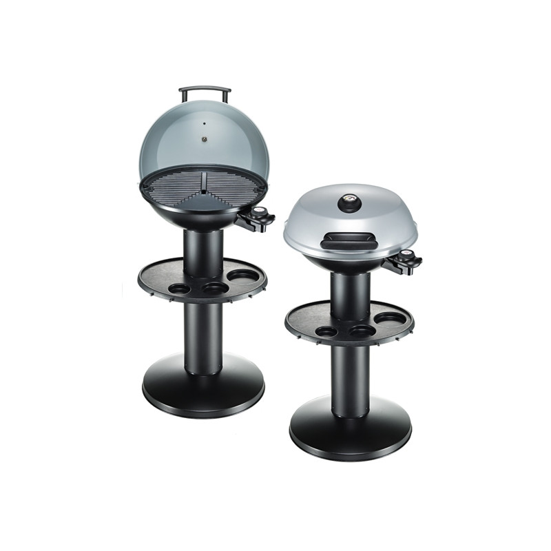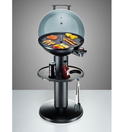 ROMMELSBACHER Барбекю BBQ 2004/S • Мощност: 2200 W • Захранване: 230 V, 50 Hz • Стойка с основа за монтиране на барбекюто • Корпус закрепен на основата • Табла за стойката с възможност за закачане на готварска щипка и поставяне на сосове за овкусяване • Капак на барбекюто - закрепен на панти • Температурен дисплей на капака • Разглобяема грил-плоча със загряващ елемент • Диаметър на плочата: Ø 40 см • Плочата е снабдена с 2 оребрени и 1 гладка зони за готвене • Незалепващо 3-слойно покритие на плочата - помага за лесното почистване след употреба • Подвижен температурен регулатор • Възможност за приготвяне на храната на отворен или затворен капак: –  Директно печене на скара с отворен капак – с топлина от отдолу. Препоръчително за храна с време за приготвяне под 25 минути, например, всякакъв вид стекове, котлети, наденички, шишове от месо, зеленчуци или риба, морски дарове и други – Индиректно печене на скара със затворен капак – препоръчва се за храна с по-продължително време за приготвяне, например цели пилета или риби, вретена и други. Топлината се разпределя равномерно, храната се приготвя равномерно и остава крехка и сочна • Улей за изтичане на мазнина• Тавичка за излишната мазнина • Прибор за почистване на плочата за готвене • Размери: 47 х 49 х 92,5 см• Тегло: 9,4 кг•  Гаранция 24 месецаПроизводител: ROMMELSBACHER / Германия