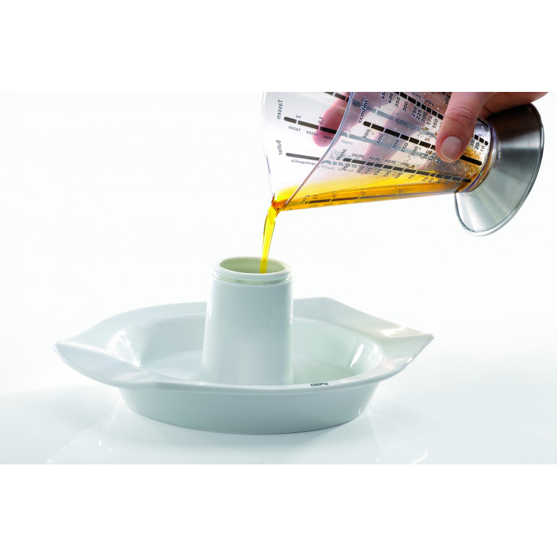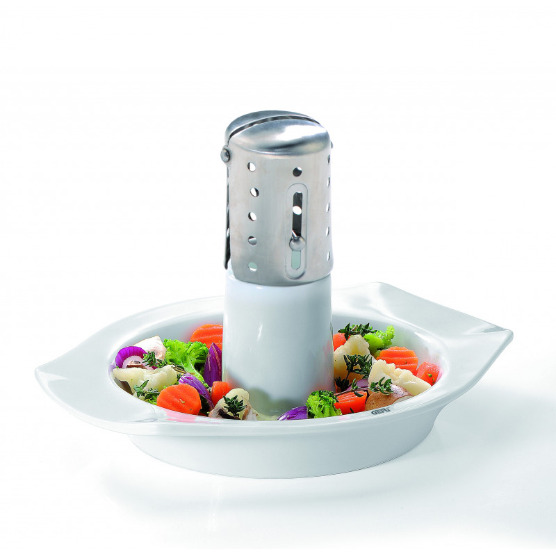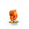За хрупкава коричка отвън, и сочно пиле отвътре. Напълнете контейнера с марината, вино или бира (300мл), поставете стоманената арома капачка (120мл), намажете пилето с маринатата, поставете го на прибора и изпечете за около 60 мин. Подходящ за употреба във фурна до 220°С. Порцелановия съд позволява едновременното приготвяне на гарнитура и пази фурната чиста. Изработени от порцелан и неръждаема стомана, подходящи за съдомиялна машина.