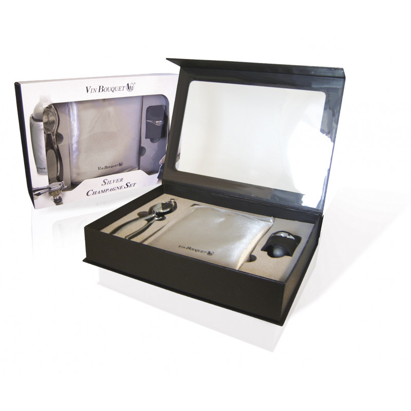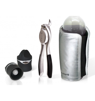 Сет за шампанско - SILVER включва отварачка, с която лесно ще отворите всяка бутилка шампанско, пенливо вино или сайдер. Лесна за използване, тя има кука за отстраняване на телената клетка и отваря бутилката с едно завъртане.