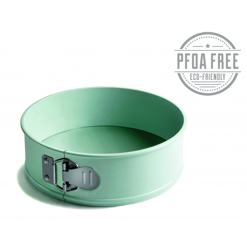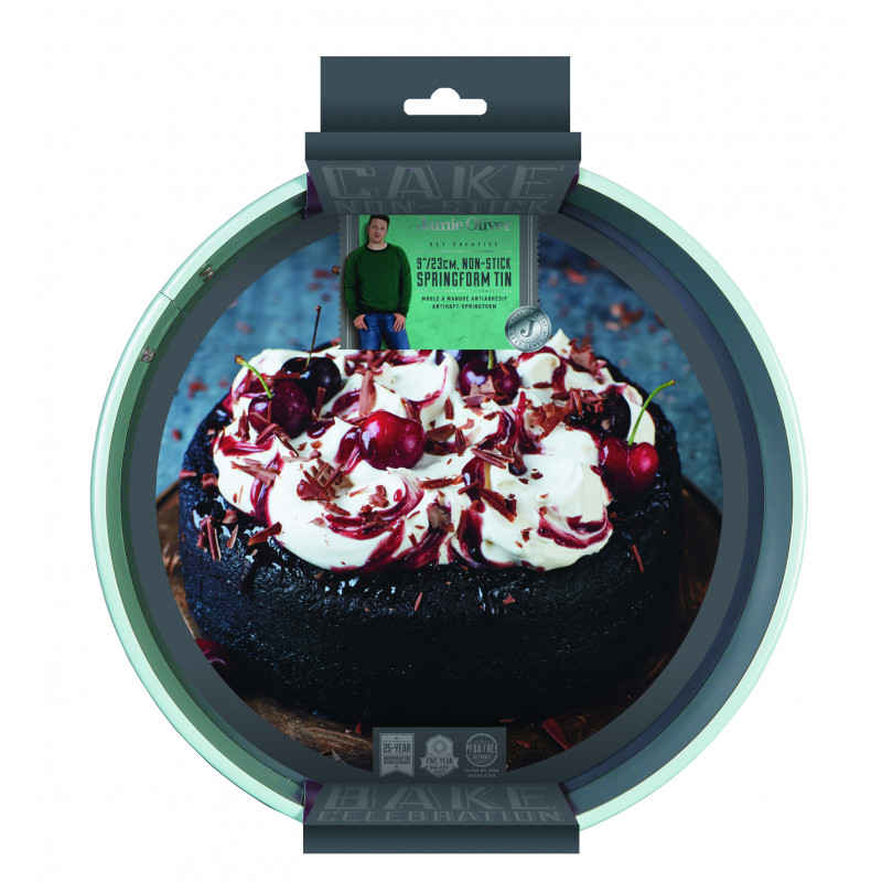 Кръгла форма за торта с падащо дъно и пружинен механизъм Jamie Oliver• Диаметър: Ø 23см• Височина: 8см• Униклано гладките страни не оставят никакви следи по блата;• Стоманен затягащ механизъм;• Заоблени ръбове за добавена здравина и устойчивост, без огъване;• Двойният слой незалепващо покритие гарантира лесно освобождаване всеки път;• Падащото дъно плътно прилепва за основата за създаване на перфектни резултати;• Безвредно незалепващо покритие Quantum II, без съдържание на PFOA;• За температура до 240°С