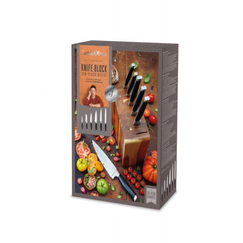 JAMIE OLIVER Комплект от 6 броя ножове в блок от акация• В комплекта: – Нож на майстора с дължина на острието: 17,5 см – Универсален нож с дължина на острието: 14 см– Нож за плодове и зеленчуци с дължина на острието: 10 см– Карвинг нож с дължина на острието: 18,5 см– Нож сантоку с дължина на острието: 13 см– Нож за хляб с дължина на острието: 20,5 см• Дървен блок от акация• Материал: висококачествена неръждаема стомана• Ергономични дръжки• За да почистите, ръчно измийте с топла сапунена вода и изсушете добре.Производител: DKB Hausehold / Англия