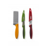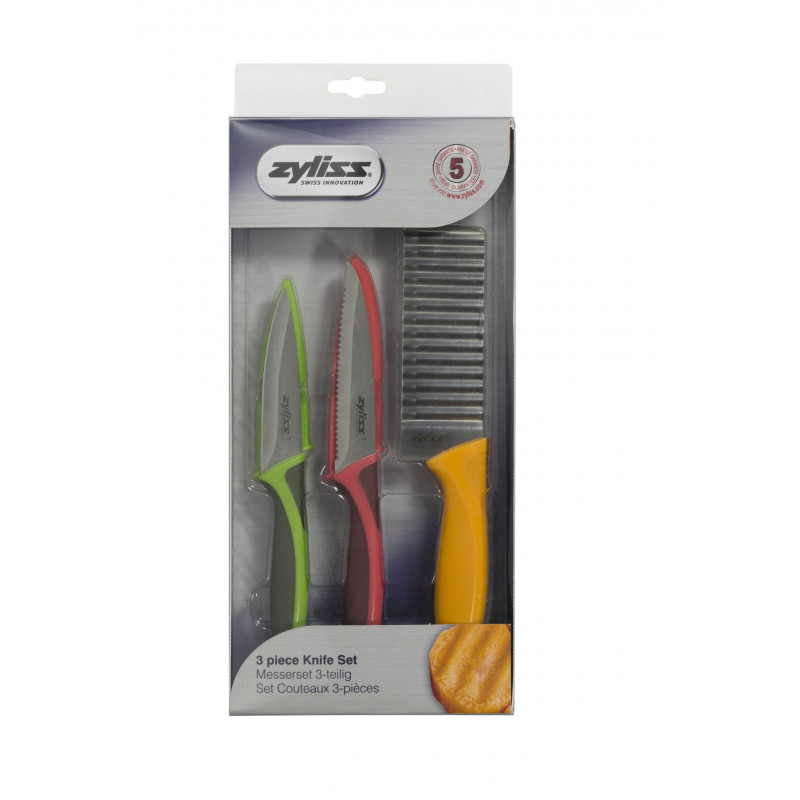 • Материал: Стомана, пластмаса• Комплектът съдържа: - Кухненски нож за зеленчуци и плодове: 9 см - зелена дръжка - Кухненски нож с назъбенo острие: 10 см - червена дръжка - Кухненски нож за декорация: 12 см - оранжева дръжкаПроизводител: ZYLISS / Швейцария