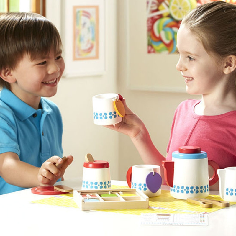 Чайник с капак, 2 чаши, 2 лъжички, захарница, каничка мляко, 6 различни видове чай и две бискитки.