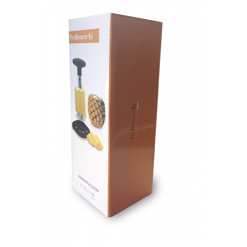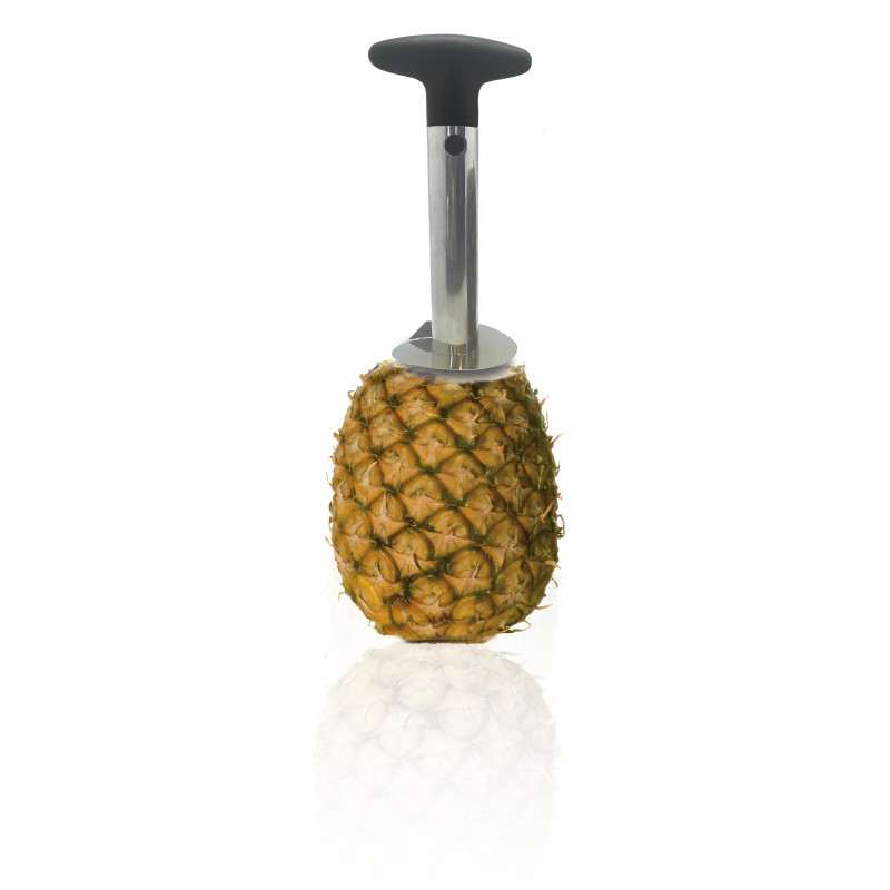 Край на мъките при беленето и рязането на ананас. Край на загубения сок от плода. С тази резачка за aнанас лесно обелвате плода и изваждате сърцевината, нарязана на равни шайби. Така получавате повече плод и запазвате повече сок вътре в него. Допълнителната резачка в комплекта нарязва бързо и лесно шайбите на абсолютно еднакви кубчета (резачката може да се използва и за други плодове - ябълки, круши и др.)