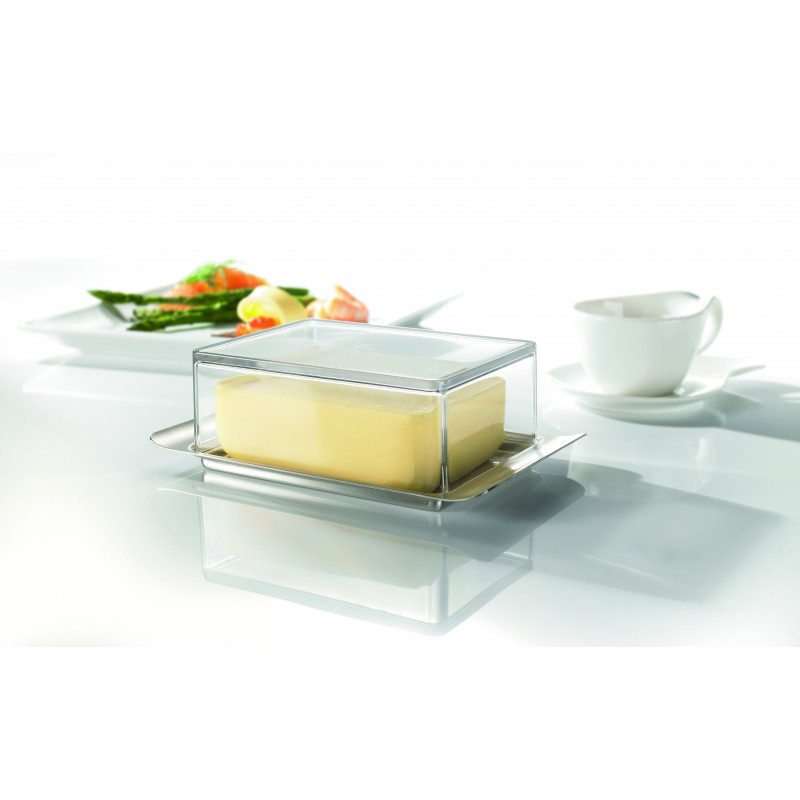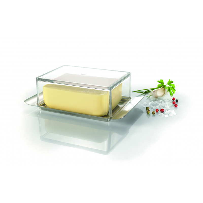 Кутията за масло не само изглежда добре, но и е много удобна. Основата е тясна, изработена от неръждаема стомана, за да пасне на вратата на всеки хладилник. Ергономични дръжки и капак от висококачествена пластмаса със стъклен ефект – изключително здрав и стилен. Капакът не влиза в контакт с маслото и го предпазва от мухи, насекоми или други външни влияния. Кутията е подходяща за 250гр масло. Подходяща за съдомиялна машина.