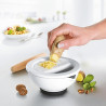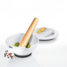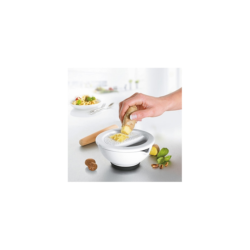 Специалните прорези по стенитеи на този порцеланов хаван, помагат за по-добро стриване и смачкване на подправки. А рендето на капака служи за бързо и лесно да се настържат джинджифил, индийско орехче, пармезан или др.