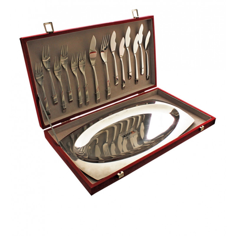 HERDMAR Комплект за риба ALFA  от 15 части• Изработен от неръждаема стомана 18/10Комплектът включва:• Нож за риба: 6 бр.• Вилица за риба: 6 бр.• Плато за сервиране: 1 бр.• Сет за сервиране -  (1 бр голям нож за риба и 1 бр голяма вилица за сервиране)ПРОИЗВОДИТЕЛ: HERDMAR / Португалия