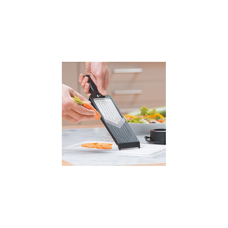 Изключително компактното  V- образно ренде с държач - предпазител е с  5 регулируеми  дебелини (1- 5 mm ) за рязане .